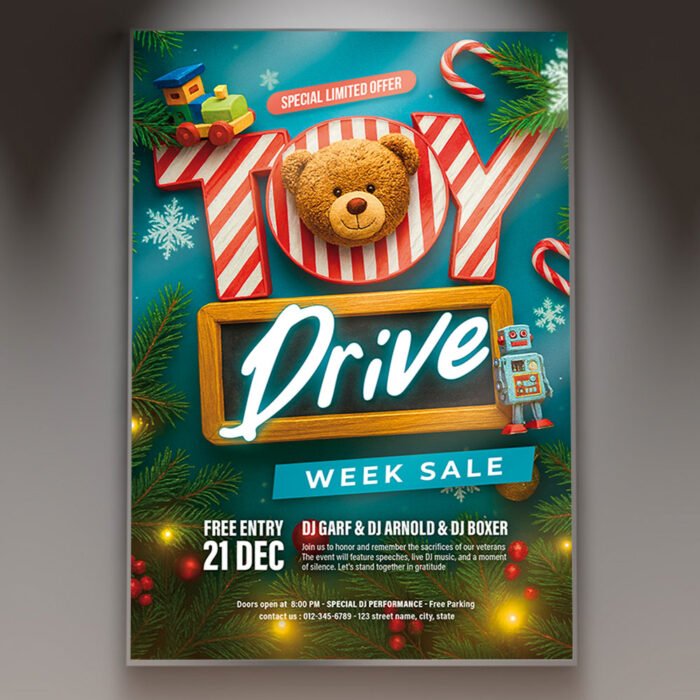 — Why Choose This Toy Drive Sale Flyer Template?Choosing the **Toy Drive Sale Flyer Template** is the most effective way to communicate a clear, exciting, and morally compelling offer. Its professional, dynamic, and generous design will instantly attract both bargain hunters and altruistic donors, ensuring a win-win event! — Similar Flyer Templates You Might Like**Note:** The provided links are for other high-energy and seasonal event templates, which are relevant to the Christmas and New Year period.