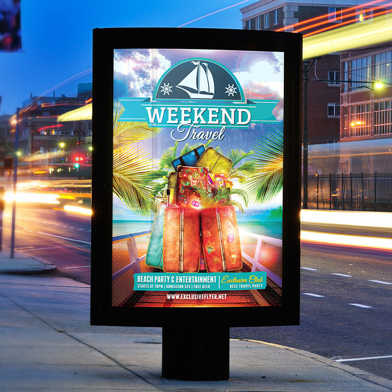 The Travel Weekend is the exclusive Photoshop PSD flyer template designed by ExclusiveFlyer to promote your Travel Weekend Night. This is a modern, stylish flyer and just be used for a Travel Night or Spring Party or Summer Night etc. Dear customers! – you can also: Customize any flyers or Hire Us to create any unique product. Also, you can get unlimited access to all our templates. You can buy 1 month membership, 3 or 6 months membership or even 1 year membership plan and login on site, choose a design, click the button DOWNLOAD TEMPLATE and it’s yours. No hassle, no checkout! When you paid the template, you can find it in your personal account and of course you’ve got a message to your e-mail (maybe in spam) with link to download. Also, you can find all templates, which you buy, in your personal account! All of our flyers have a very good quality (300DPI). And it means that you just need to download one of them and make the necessary modifications such as replace the elements or choose the colors and start to invite your guests! You can order from us design of Banner Ad, Bi-Fold Brochure, Tri-Fold Brochure, Business Card, Logo, One-Sided Flyer, Two-sided Flyer or Postcard. All you need is to checkout and write us all information on our e-mail or skype. (order now). There are a lot of free flyer templates, free business card templates on our site! Also there are a lot of categories of flyers such as club flyers, seasonal flyers, sport flyers and also business flyers. You have a great choise on our site, so good luck! Don’t forget to follow our Facebook community, our page on Twitter, on Pinterest and on Tumblr and leave comments, cause we work for you! PSD is set up in 1275×1875 dimension (4” x 6” with 0,25” bleed). The PSD file is very well organised, with color coded groups and layers named appropriately. Remember, all stock images of models and other people used only for demonstration all charms of the flyer and don’t included in the download!