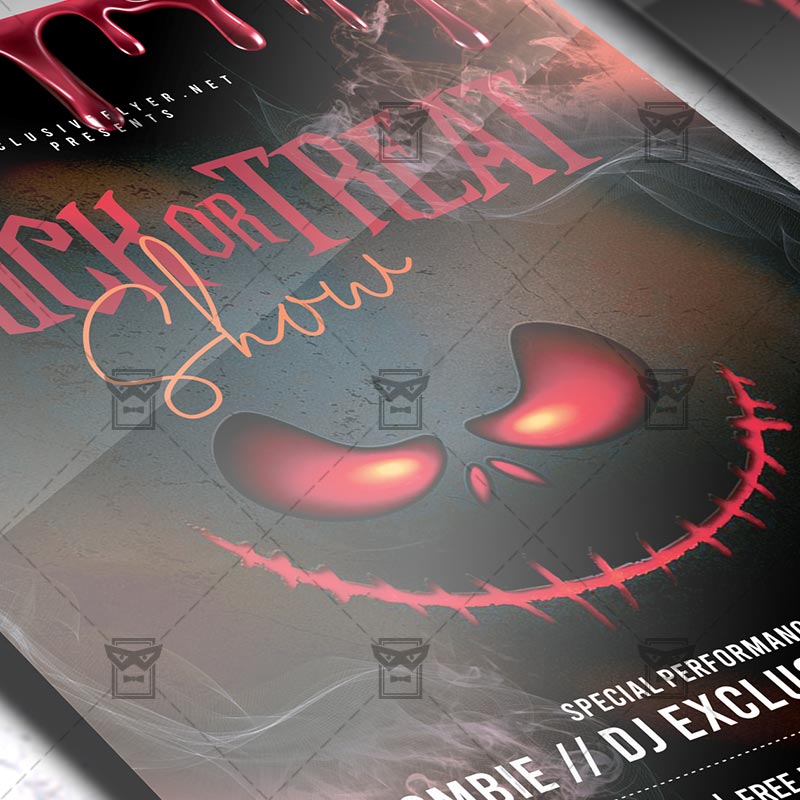 Trick or Treat Flyer an exclusive PSD flyer template for Adobe Photoshop designed by our best graphic designers to facilitate your task in promoting your business. With our readymade Club flyer in psd format you can invite you customers and guest to your event or to the best Spooky Night, Halloween Night, Beautiful Nightmare, Scary Night Party or Halloween Affair in their lives.
