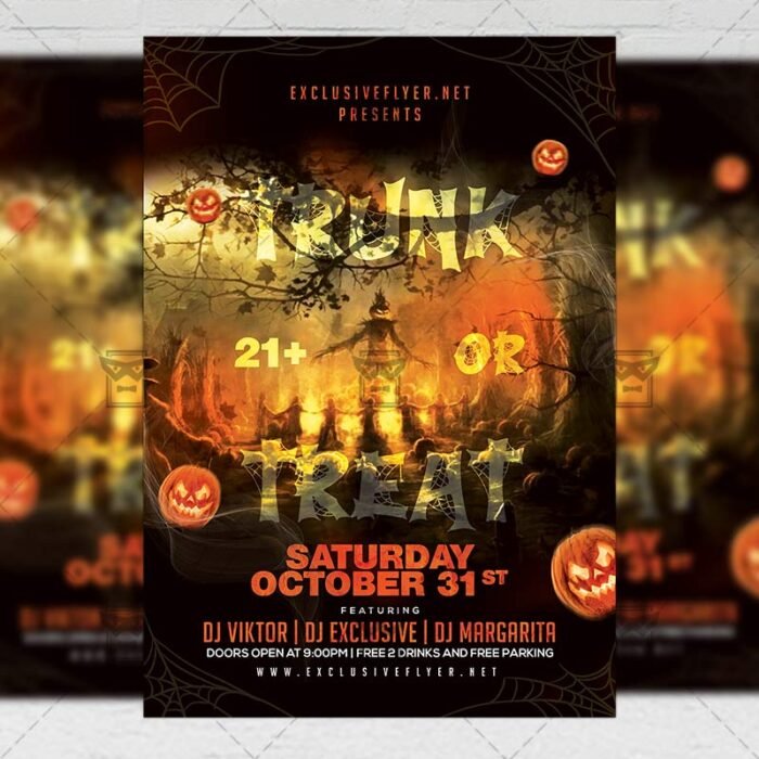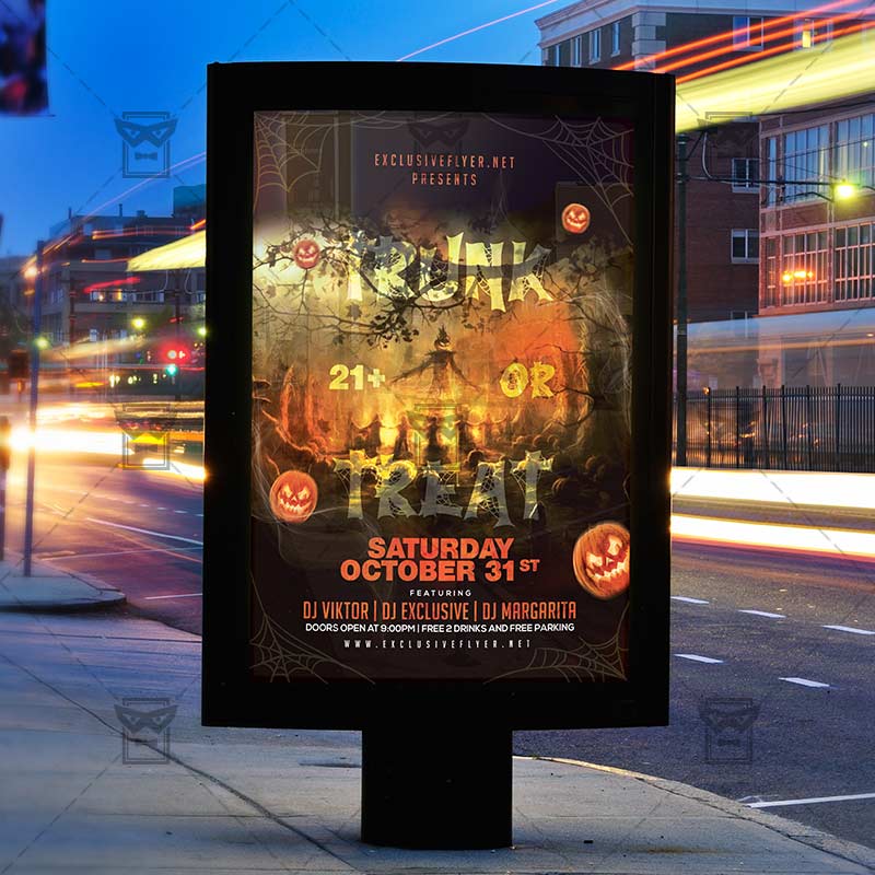Trunk or Treat Flyer an exclusive PSD flyer template for Adobe Photoshop designed by our best graphic designers to facilitate your task in promoting your business. With our readymade Club flyer in psd format you can invite you customers and guest to your event or to the best Spooky Night, Halloween Night, Beautiful Nightmare, Scary Night Party or Halloween Affair in their lives.