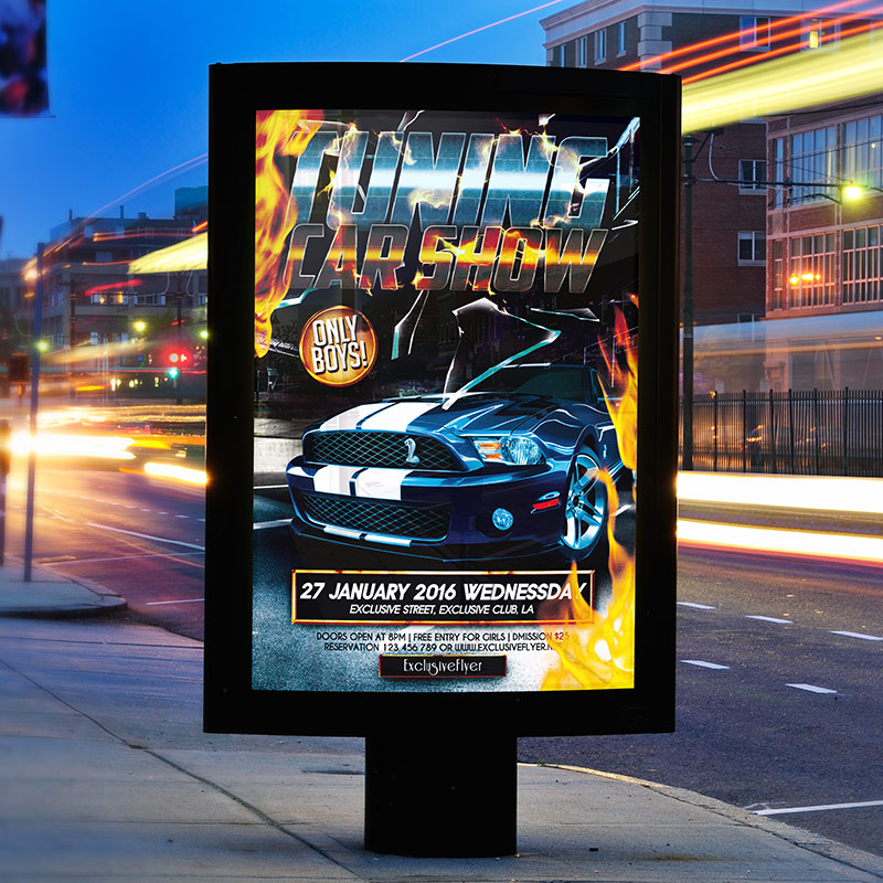 The Tuning Car Show is the exclusive Photoshop PSD flyer template designed by ExclusiveFlyer to promote your Tuning Car Show. This is a modern, stylish flyer and just be used for a Car Show, Tuning Car Night etc. Dear customers! – you can also: Customize any flyers or Hire Us to create any unique product. Also, you can get unlimited access to all our templates. You can buy 1 month membership, 3 or 6 months membership or even 1 year membership plan and login on site, choose a design, click the button DOWNLOAD TEMPLATE and it’s yours. No hassle, no checkout! When you paid the template, you can find it in your personal account and of course you’ve got a message to your e-mail (maybe in spam) with link to download. Also, you can find all templates, which you buy, in your personal account! All of our flyers have a very good quality (300DPI). And it means that you just need to download one of them and make the necessary modifications such as replace the elements or choose the colors and start to invite your guests! You can order from us design of Banner Ad, Bi-Fold Brochure, Tri-Fold Brochure, Business Card, Logo, One-Sided Flyer, Two-sided Flyer or Postcard. All you need is to checkout and write us all information on our e-mail or skype. (order now). There are a lot of free flyer templates, free business card templates on our site! Also there are a lot of categories of flyers such as club flyers, seasonal flyers, sport flyers and also business flyers. You have a great choise on our site, so good luck! Don’t forget to follow our Facebook community, our page on Twitter, on Pinterest and on Tumblr and leave comments, cause we work for you! PSD is set up in 1275×1875 dimension (4” x 6” with 0,25” bleed). The PSD file is very well organised, with color coded groups and layers named appropriately. Remember, all stock images of models and other people used only for demonstration all charms of the flyer and don’t included in the download!