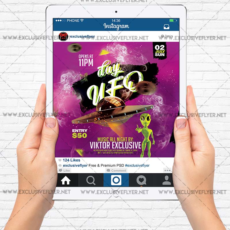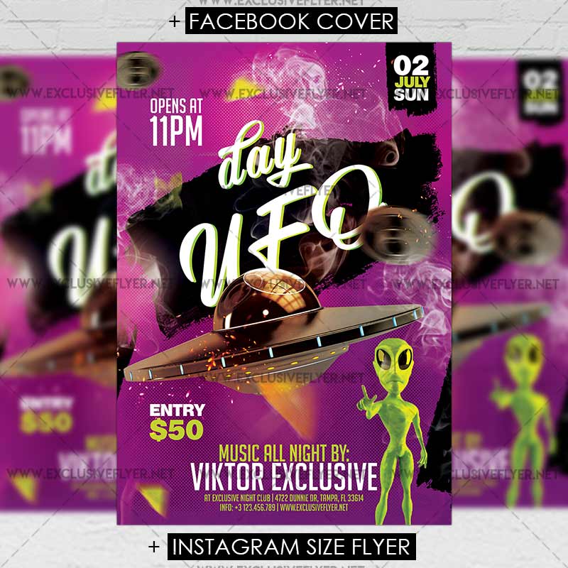 The UFO Day is the exclusive Photoshop PSD flyer template designed by ExclusiveFlyer to promote your World UFO Day Party. This is a modern, stylish flyer and just be used for a UFO Day Celebration, Space Night, Alien Party etc.