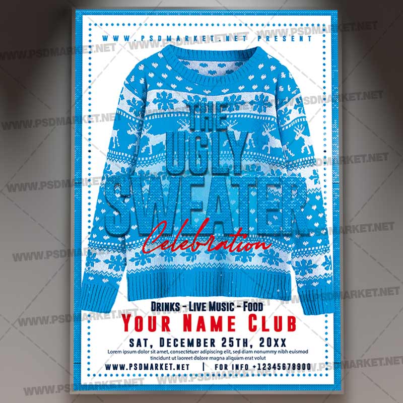Ugly Sweater Event Flyer is a simply modern flyer design by PSDmarket Team to be used with Photoshop CS3 and higher. Save your time and use it for business or for your clients! This can be use for Ugly Sweater Event, Ugly Sweater, Ugly Sweater Party, Sweater Party, Ugly Sweater Night, New Year Party, Winter Party, Rude Sweater or Christmas Event and others.