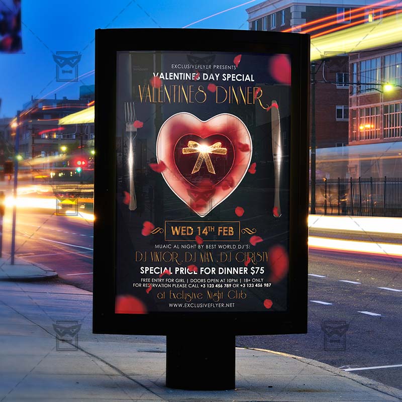 Valentines Dinner is an exclusive PSD flyer template for Adobe Photoshop designed by our best graphic designers to facilitate your task in promoting your business. With our readymade Valentines flyer in psd format you can invite you customers and guest to your event or to the best Valentine Celebration Dinner or Romantic Dinner in their lives.