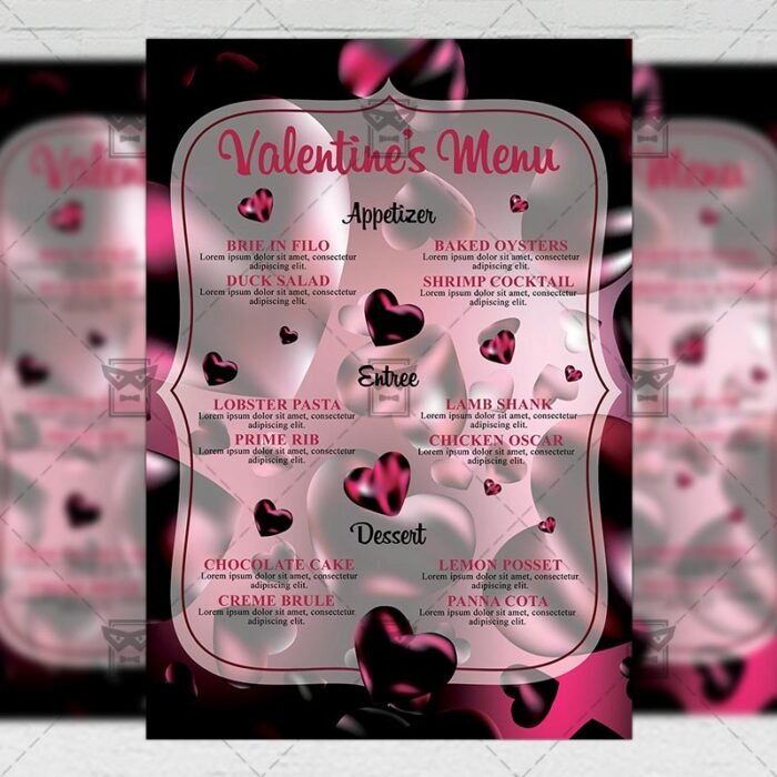 Valentines Menu is an exclusive PSD flyer template for Adobe Photoshop designed by our best graphic designers to facilitate your task in promoting your business. With our readymade Valentines flyer in psd format you can invite you customers and guest to your event or to the best Love Party, Valentines Night, V-Day Party Night or St. Valentines Day Celebration Party in their lives.