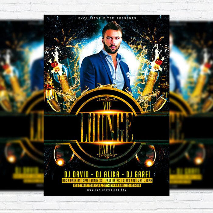 The VIP Lounge Party is the exclusive Photoshop PSD flyer template designed by ExclusiveFlyer to promote your VIP Lounge Party. This is a modern, stylish flyer and just be used for a VIP Lounge Night or VIP Party, or Lounge Night. Dear customers! – you can also: Customize any flyers or Hire Us to create any unique product. Also, you can get unlimited access to all our templates. You can buy 1 month membership, 3 or 6 months membership or even 1 year membership plan and login on site, choose a design, click the button DOWNLOAD TEMPLATE and it’s yours. No hassle, no checkout! When you paid the template, you can find it in your personal account and of course you’ve got a message to your e-mail (maybe in spam) with link to download. Also, you can find all templates, which you buy, in your personal account! All of our flyers have a very good quality (300DPI). And it means that you just need to download one of them and make the necessary modifications such as replace the elements or choose the colors and start to invite your guests! You can order from us design of Banner Ad, Bi-Fold Brochure, Tri-Fold Brochure, Business Card, Logo, One-Sided Flyer, Two-sided Flyer or Postcard. All you need is to checkout and write us all information on our e-mail or skype. (order now). There are a lot of free flyer templates, free business card templates on our site! Also there are a lot of categories of flyers such as club flyers, seasonal flyers, sport flyers and also business flyers. You have a great choise on our site, so good luck! Don’t forget to follow our Facebook community, our page on Twitter, on Pinterest and on Tumblr and leave comments, cause we work for you! PSD is set up in 1275×1875 dimension (4″×6″ with 0,25″ bleed). The PSD file is very well organised, with color coded groups and layers named appropriately. Remember, all stock images of models and other people used only for demonstration all charms of the flyer and don’t included in the download!
