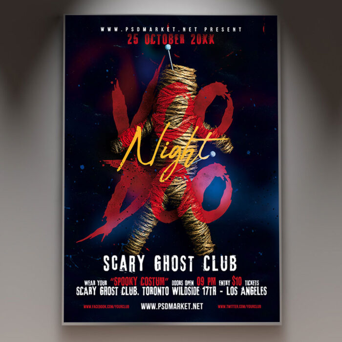 Voodoo Flyer TemplateUnleash the spirits and summon the night with our enchanting **Voodoo Flyer Template**! This mystical and eerie design is perfect for promoting Halloween parties, themed club nights, supernatural events, or any gathering that delves into the dark and magical world of voodoo and mysticism. If you’re looking to create an irresistible invitation that whispers “feel the magic,” “beware the darkness,” and “a night of pure enchantment,” this flyer template is engineered to draw a brave and curious crowd. Expect to see striking visuals, often incorporating mysterious elements like voodoo dolls, mystical skulls, flickering candles, and ancient, cryptic typography that captures the supernatural and exhilarating spirit of a voodoo-themed event. This template is all about setting a spine-tingling and high-energy mood, making your “Voodoo Night” the ultimate destination for an epic gathering! The **Voodoo Flyer Template** offers a highly adaptable and professional layout, ensuring you can clearly communicate all the essential details of your event while perfectly maintaining its mystical and inviting spirit. You can easily customize the text fields to include the specific date and time of your party, the menacing venue location (e.g., a dimly lit club, an old house), any special entry requirements or ticket tiers, and information about featured entertainment (e.g., a live DJ spinning eerie tunes), special contests (e.g., a costume contest), or enticing food and drink specials (e.g., “potion” drinks, themed cocktails), all presented in a clear and appealing way. Add an enticing description of what attendees can expect, perhaps highlighting opportunities for a psychic reading, a “spell casting” activity, or simply mingling in a thrillingly mystical atmosphere. Detail any exciting features like a designated VIP area with dark decor, a special prize for the “best cursed costume,” or a thrilling scavenger hunt. And of course, include clear contact information or prominent social media handles for further engagement and ticket sales. Many templates also provide exciting options to incorporate additional dynamic graphics like subtle light effects, ancient symbols, or eerie fog, or to adjust the impactful color palette (often deep purples, sinister blacks, and glowing greens) to perfectly match your brand’s aesthetic or the event’s specific supernatural theme. This lets you create a truly unique and memorable promotional piece that looks as chilling and exciting as your event feels. Engineered for maximum reach, the **Voodoo Flyer Template** is designed to be both print-ready for stunning physical distribution and seamlessly optimized for digital sharing. This ensures your exciting invitation reaches a wide and enthusiastic audience. Create eye-catching physical flyers to distribute at clubs, themed bars, community centers, or through local event groups. Effortlessly share the flyer digitally through various social media channels with engaging captions that highlight the night’s eerie energy, email announcements that build anticipation, and online event listings that attract horror fans, party-goers, and anyone looking for a thrilling night. This dual functionality helps to maximize visibility and create significant buzz around your Voodoo Night. By utilizing this distinctive and attention-grabbing flyer template, you’re not just announcing a party; you’re creating an invitation that broadcasts pure mystical fun and promises an experience filled with great music, costumes, and unforgettable scares, making your “Voodoo Night” the ultimate destination for an epic gathering. Grab this template today and prepare to conjure up some fun! — Features of the Voodoo Flyer Template