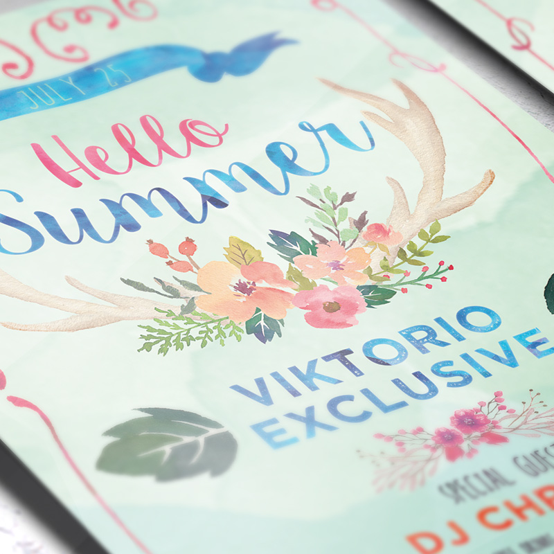 The Watercolor Summer is the exclusive Photoshop PSD flyer template designed by ExclusiveFlyer to promote your Watercolor Summer Party. This is a modern, stylish, green flyer and just be used for a Summer Party or maybe Spring Night. Dear customers! – you can also: Customize any flyers or Hire Us to create any unique product. Also, you can get unlimited access to all our templates. You can buy 1 month membership, 3 or 6 months membership or even 1 year membership plan and login on site, choose a design, click the button DOWNLOAD TEMPLATE and it’s yours. No hassle, no checkout! When you paid the template, you can find it in your personal account and of course you’ve got a message to your e-mail (maybe in spam) with link to download. Also, you can find all templates, which you buy, in your personal account! All of our flyers have a very good quality (300DPI). And it means that you just need to download one of them and make the necessary modifications such as replace the elements or choose the colors and start to invite your guests! You can order from us design of Banner Ad, Bi-Fold Brochure, Tri-Fold Brochure, Business Card, Logo, One-Sided Flyer, Two-sided Flyer or Postcard. All you need is to checkout and write us all information on our e-mail or skype. (order now). There are a lot of free flyer templates, free business card templates on our site! Also there are a lot of categories of flyers such as club flyers, seasonal flyers, sport flyers and also business flyers. You have a great choise on our site, so good luck! Don’t forget to follow our Facebook community, our page on Twitter, on Pinterest and on Tumblr and leave comments, cause we work for you! PSD is set up in 1275×1875 dimension (4″×6″ with 0,25″ bleed). The PSD file is very well organised, with color coded groups and layers named appropriately. Remember, all stock images of models and other people used only for demonstration all charms of the flyer and don’t included in the download!