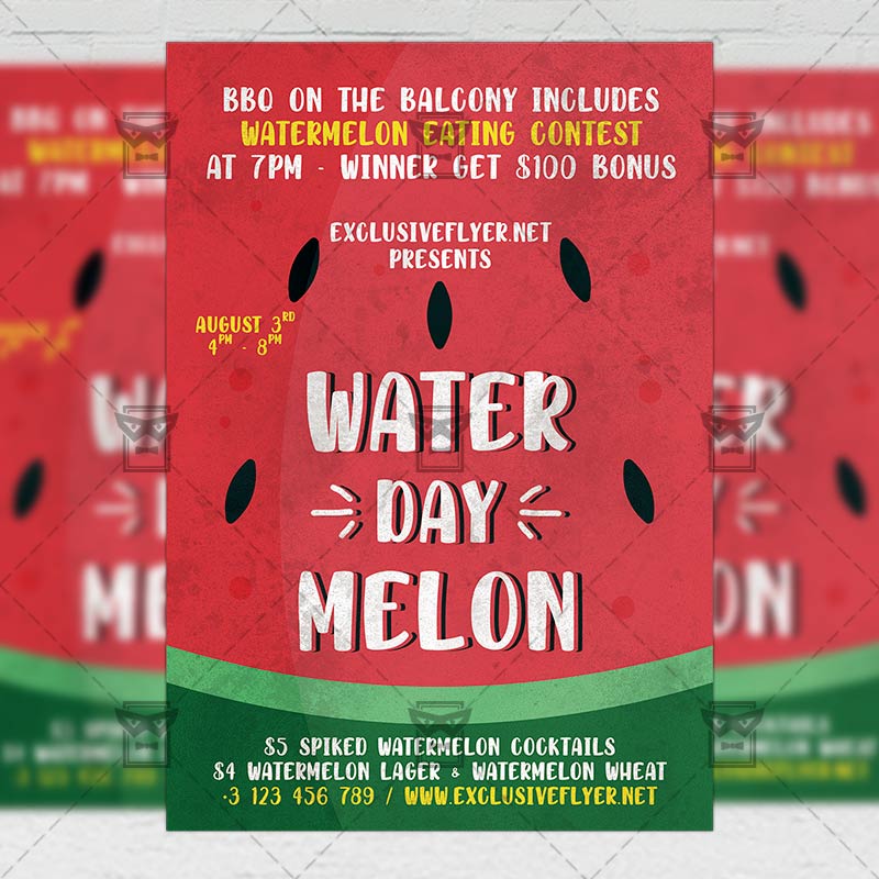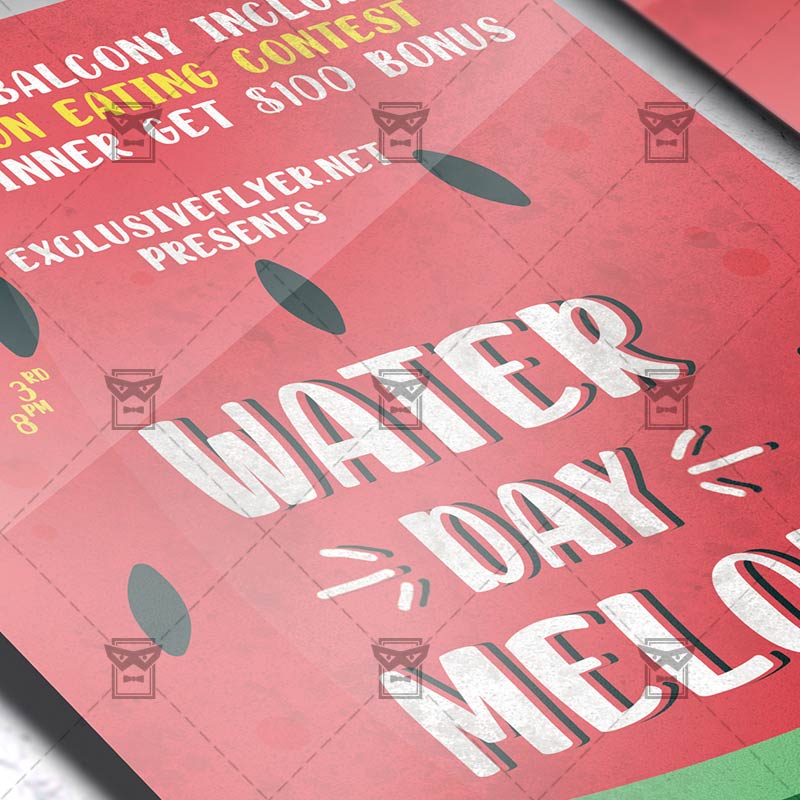 Watermelon Day Template an exclusive PSD flyer template for Adobe Photoshop designed by our best graphic designers to facilitate your task in promoting your business. With our readymade Club flyer in psd format you can invite you customers and guest to your event or to the best Watermelon Day Celebration, Watermelon Eating Contest, National Watermelon Day or Watermelon Party in their lives.