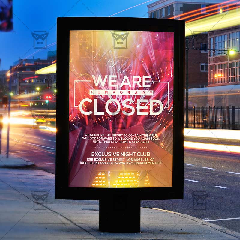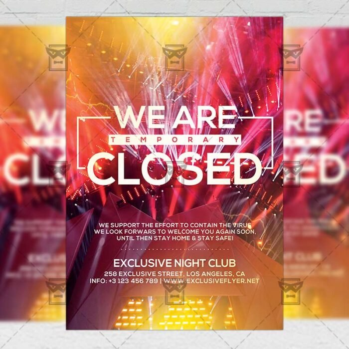 We Are Closed Template an exclusive PSD flyer template for Adobe Photoshop designed by our best graphic designers to facilitate your task in promoting your business. With our readymade Club flyer in psd format you can invite you customers and guest to your event or to the best Club Closed, Club Temporary Closed, We are Closed or Closed Club in their lives.