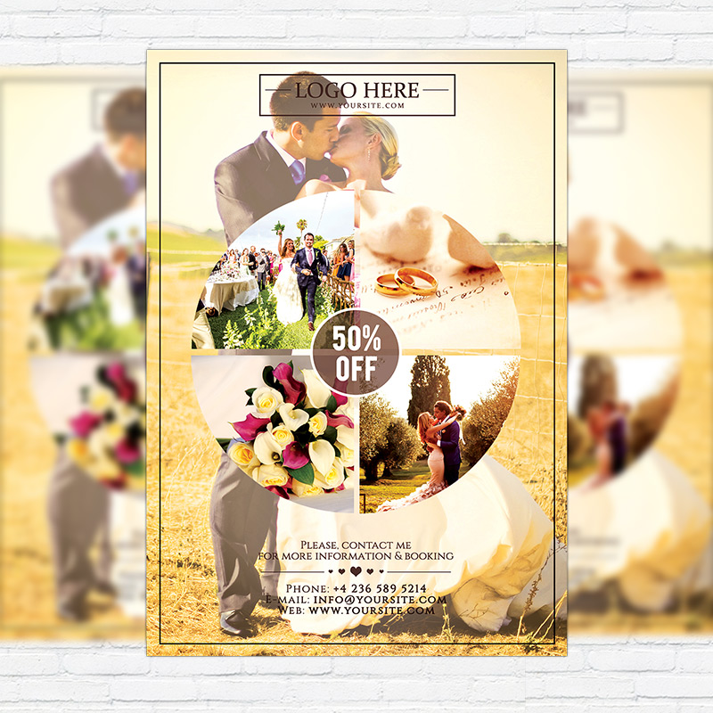 The Wedding Photography is the exclusive Photoshop PSD flyer template designed by ExclusiveFlyer to promote your Photography Business. This is a modern, stylish flyer and just be used for a Wedding Photography or Corporate Photograpty etc. Dear customers! – you can also: Customize any flyers or Hire Us to create any unique product. Also, you can get unlimited access to all our templates. You can buy 1 month membership, 3 or 6 months membership or even 1 year membership plan and login on site, choose a design, click the button DOWNLOAD TEMPLATE and it’s yours. No hassle, no checkout! When you paid the template, you can find it in your personal account and of course you’ve got a message to your e-mail (maybe in spam) with link to download. Also, you can find all templates, which you buy, in your personal account! All of our flyers have a very good quality (300DPI). And it means that you just need to download one of them and make the necessary modifications such as replace the elements or choose the colors and start to invite your guests! You can order from us design of Banner Ad, Bi-Fold Brochure, Tri-Fold Brochure, Business Card, Logo, One-Sided Flyer, Two-sided Flyer or Postcard. All you need is to checkout and write us all information on our e-mail or skype. (order now). There are a lot of free flyer templates, free business card templates on our site! Also there are a lot of categories of flyers such as club flyers, seasonal flyers, sport flyers and also business flyers. You have a great choise on our site, so good luck! Don’t forget to follow our Facebook community, our page on Twitter, on Pinterest and on Tumblr and leave comments, cause we work for you! PSD is set up in 1275×1875 dimension (4” x 6” with 0,25” bleed). The PSD file is very well organised, with color coded groups and layers named appropriately. Remember, all stock images of models and other people used only for demonstration all charms of the flyer and don’t included in the download!