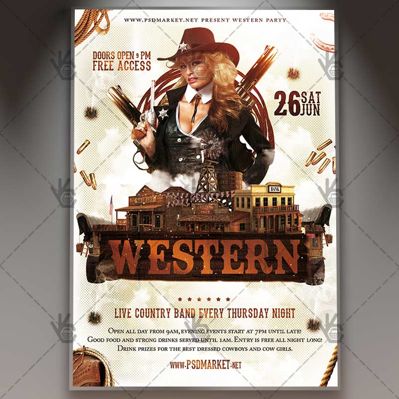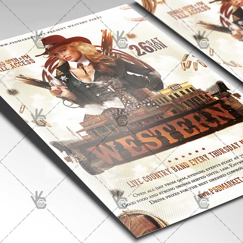 Western Party is a simply modern flyer design by PSDmarket Team to be used with Photoshop CS3 and higher. Save your time and use it for business or for your clients! This can be use for Western Party, Western Night, Wanted Party, Country Party, Wild West, Western Day and others.