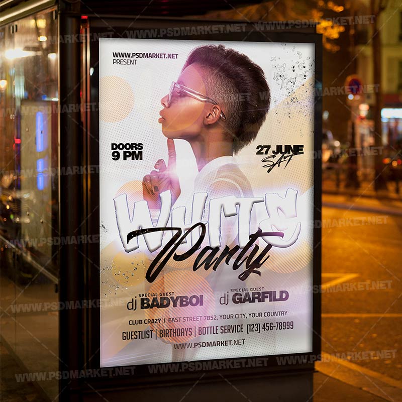 White Club Party Flyer is a simply modern flyer design by PSDmarket Team to be used with Photoshop CS3 and higher. Save your time and use it for business or for your clients! This can be use for White Club Party, White Party Event, White Night Party, The White Party, White Night, White Party Night, White and Black Fest, White and Black Dance Party, Exclusive Party, VIP Night, VIP Party or Elegant Night and others.