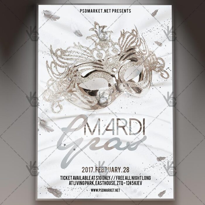 White Mardi Gras is a simply modern flyer design by PSDmarket Team to be used with Photoshop CS3 and higher. Save your time and use it for business or for your clients! This can be use for Mardi Gras Night, Carnival Party, Venetian Carnival Celebration and others.