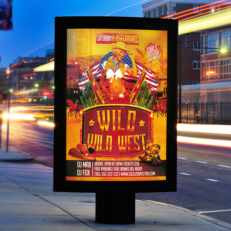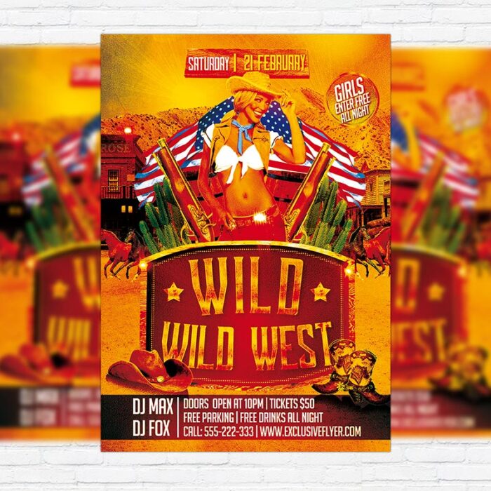 The Wild Wild West Party is the exclusive Photoshop PSD flyer template designed by ExclusiveFlyer to promote your Western Party. This is a modern, stylish flyer and just be used for a Wild West Party or Western Party, or Country Party.Dear customers! – you can also: Customize any flyers or Hire Us to create any unique product. Also, you can get unlimited access to all our templates. You can buy 1 month membership, 3 or 6 months membership or even 1 year membership plan and login on site, choose a design, click the button DOWNLOAD TEMPLATE and it’s yours. No hassle, no checkout! When you paid the template, you can find it in your personal account and of course you’ve got a message to your e-mail (maybe in spam) with link to download. Also, you can find all templates, which you buy, in your personal account! All of our flyers have a very good quality (300DPI). And it means that you just need to download one of them and make the necessary modifications such as replace the elements or choose the colors and start to invite your guests! You can order from us design of Banner Ad, Bi-Fold Brochure, Tri-Fold Brochure, Business Card, Logo, One-Sided Flyer, Two-sided Flyer or Postcard. All you need is to checkout and write us all information on our e-mail or skype. (order now). There are a lot of free flyer templates, free business card templates on our site! Also there are a lot of categories of flyers such as club flyers, seasonal flyers, sport flyers and also business flyers. You have a great choise on our site, so good luck! Don’t forget to follow our Facebook community, our page on Twitter, on Pinterest and on Tumblr and leave comments, cause we work for you! PSD is set up in 1275×1875 dimension (4″×6″ with 0,25″ bleed). The PSD file is very well organised, with color coded groups and layers named appropriately. Remember, all stock images of models and other people used only for demonstration all charms of the flyer and don’t included in the download!