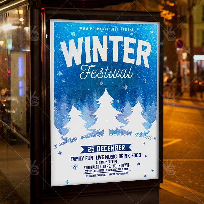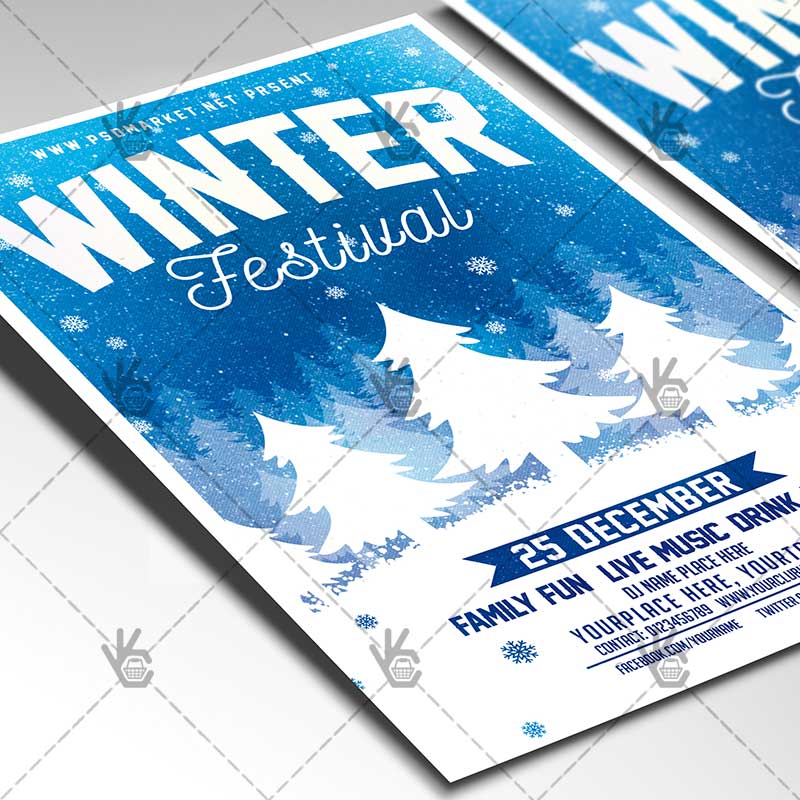 Winter Festival is a simply modern flyer design by PSDmarket Team to be used with Photoshop CS3 and higher. Save your time and use it for business or for your clients! This can be use for Winter Party, Winter Night, New Year Party, Christmas Party, Winter Madness or Winter Event and others.