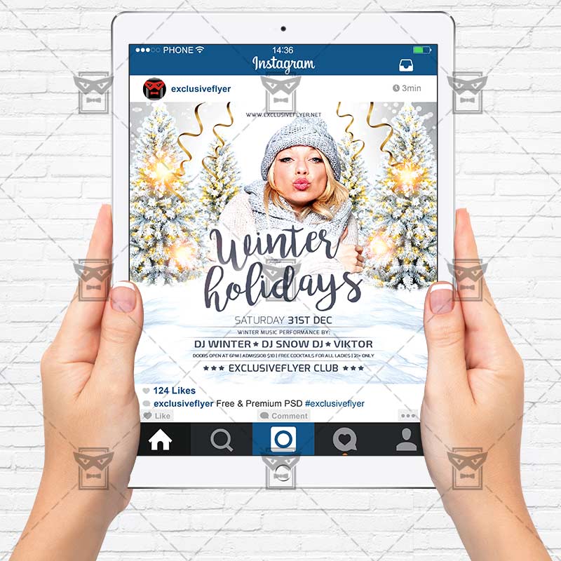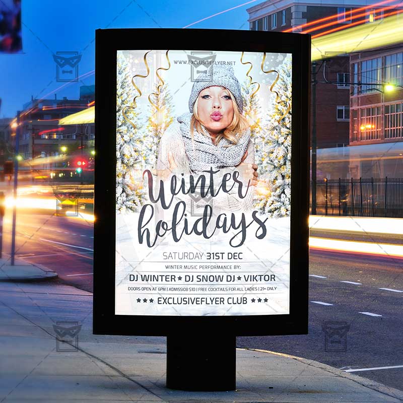 The Winter Holidays is the exclusive Photoshop PSD flyer template designed by ExclusiveFlyer to promote your Winter Holidays. This is a modern, stylish flyer and just be used for a Winter Holidays, Winter Snow Party, Winter Sounds etc. Dear customers! – you can also: Customize any flyers or Hire Us to create any unique product. Also, you can get unlimited access to all our templates. You can buy 1 month membership, 3 or 6 months membership or even 1 year membership plan and login on site, choose a design, click the button DOWNLOAD TEMPLATE and it’s yours. No hassle, no checkout! When you paid the template, you can find it in your personal account and of course you’ve got a message to your e-mail (maybe in spam) with link to download. Also, you can find all templates, which you buy, in your personal account! All of our flyers have a very good quality (300DPI). And it means that you just need to download one of them and make the necessary modifications such as replace the elements or choose the colors and start to invite your guests! You can order from us design of Banner Ad, Bi-Fold Brochure, Tri-Fold Brochure, Business Card, Logo, One-Sided Flyer, Two-sided Flyer or Postcard. All you need is to checkout and write us all information on our e-mail or skype. (order now). There are a lot of free flyer templates, free business card templates on our site! Also there are a lot of categories of flyers such as club flyers, seasonal flyers, sport flyers and also business flyers. You have a great choise on our site, so good luck! Don’t forget to follow our Facebook community, our page on Twitter, on Pinterest and on Tumblr and leave comments, cause we work for you! PSD is set up in 1275×1875 dimension (4” x 6” with 0,25” bleed). The PSD file is very well organised, with color coded groups and layers named appropriately. Remember, all stock images of models and other people used only for demonstration all charms of the flyer and don’t included in the download!