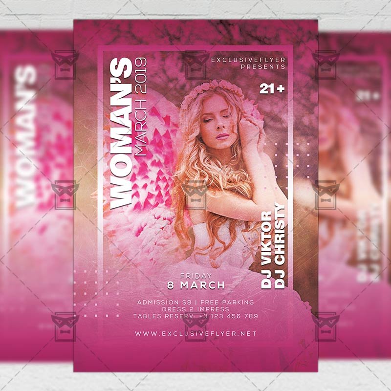 Woman’s March 2019 is an exclusive PSD flyer template for Adobe Photoshop designed by our best graphic designers to facilitate your task in promoting your business. With our readymade Carnival flyer in psd format you can invite you customers and guest to your event or to the best Womans Day Celebration, Womans Night Out or Womans Day Bash in their lives.