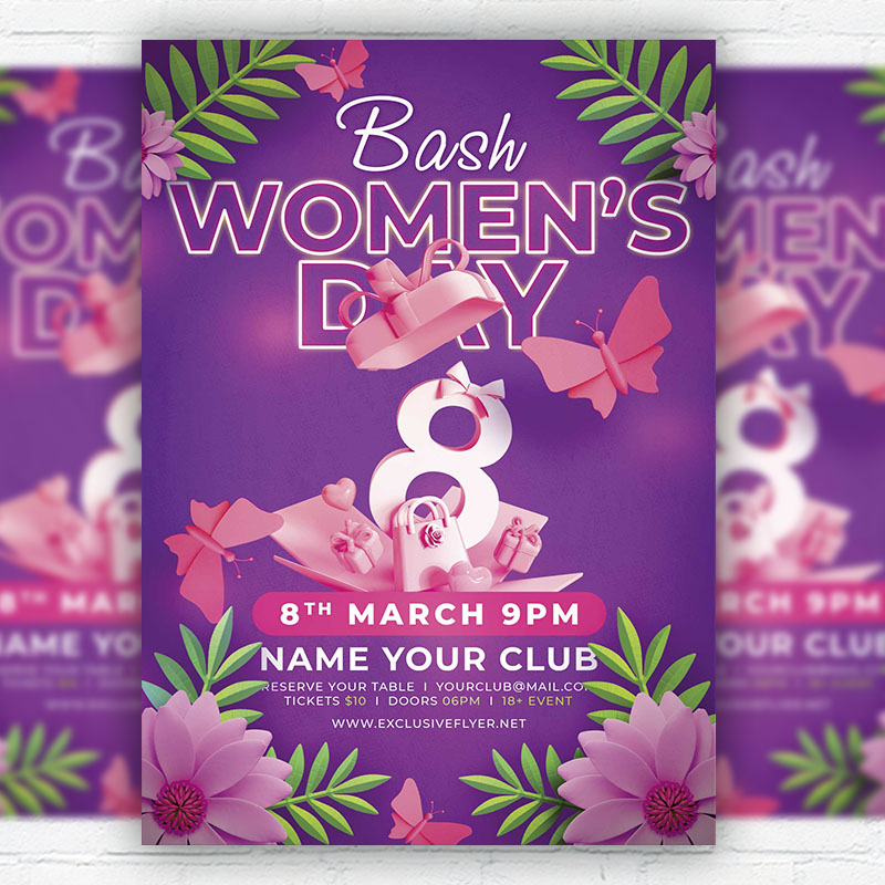 Women’s Day Bash is an exclusive PSD flyer template for Adobe Photoshop designed by our best graphic designers to facilitate your task in promoting your business. This psd poster/flyer is the best choice for Woman’s Day Celebration, Woman’s Day Celebration, 8 March Night, or International Woman’s Day. With our readymade Women’s Day Bash PSD Template flyer in psd format, you can invite your customers and guests to your event with a minimum of effort and time.