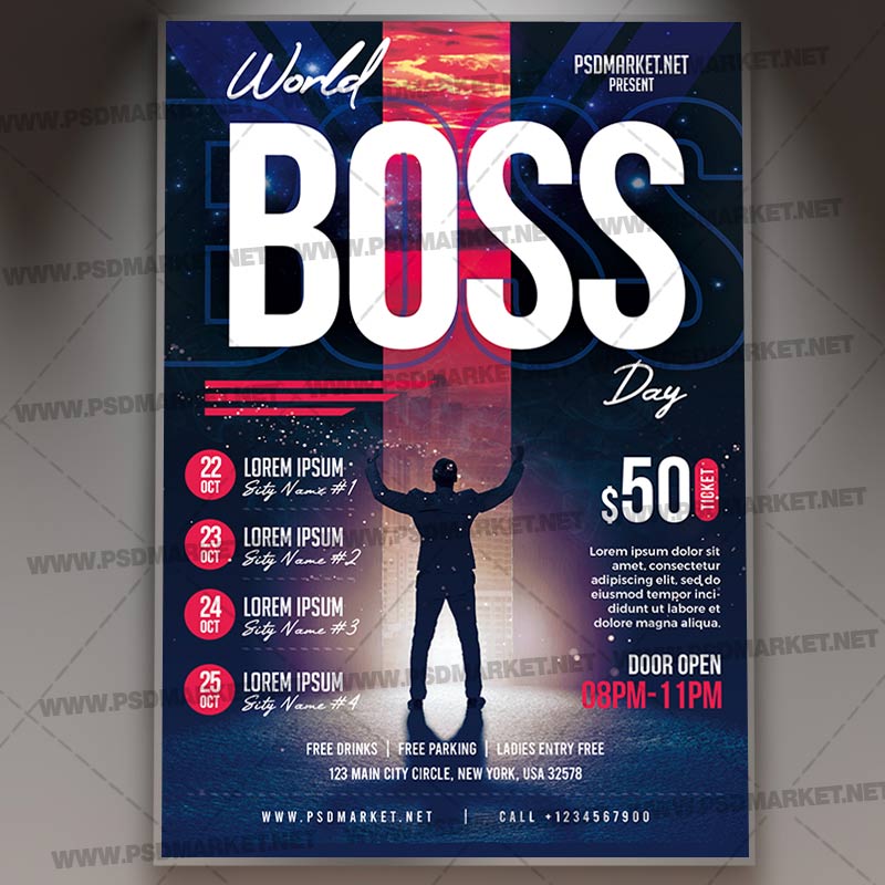 World Boss Day Template Flyer PSD is a simply modern flyer design by PSDmarket Team to be used with Photoshop CS3 and higher. Save your time and use it for business or for your clients! This can be use for World Boss Day, Boss Day Party Night, Boss Day Party, Boss Party, National Boss Day, National Boss Day Night, National Boss Day Party, Happy Boss Day, World Boss Day, Boss Day Event and others.