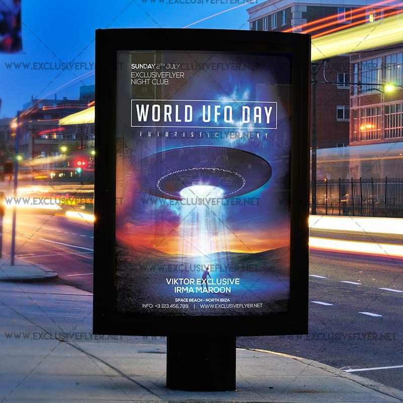The World UFO Day is the exclusive Photoshop PSD flyer template designed by ExclusiveFlyer to promote your World UFO Day Party. This is a modern, stylish flyer and just be used for a UFO Day Celebration, Space Night, Alien Party etc.