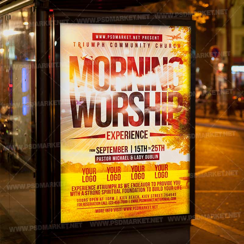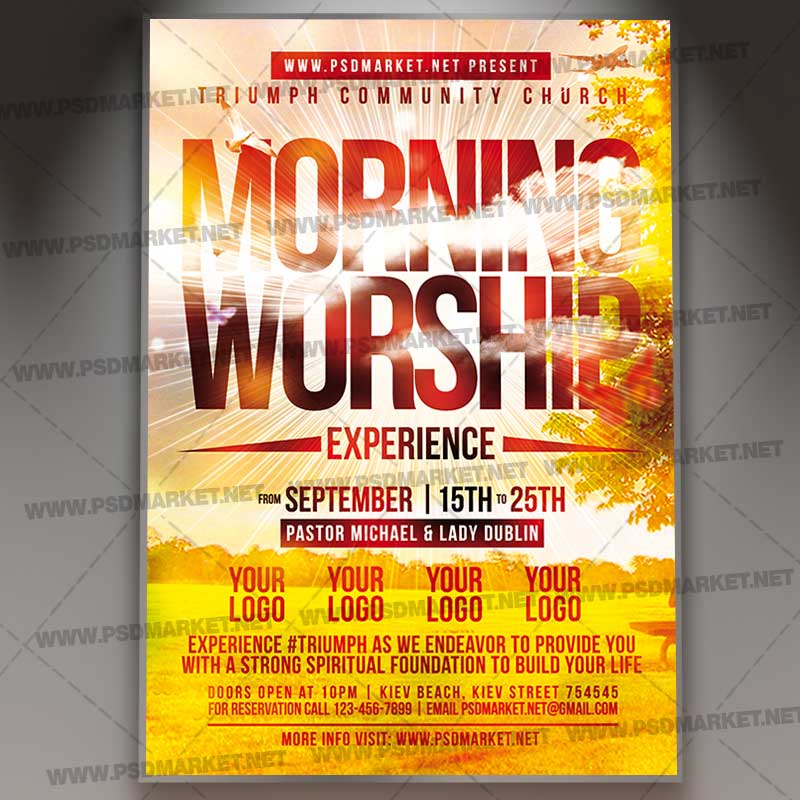 Worship Church Flyer – PSD Template is a premium Photoshop PSD flyer / poster template designed by PSDmarket to be used with Photoshop CS3 and higher.
