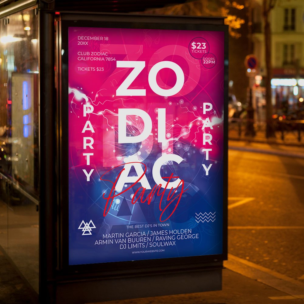Zodiac Party Flyer PSD TemplateAlign the stars and ignite a cosmic energy in your venue with the Zodiac Party Flyer PSD Template. In 2026, the intersection of astrology and high-end nightlife has reached its peak, with guests seeking immersive, spiritually-charged social experiences. This premium Photoshop template captures that mystical allure, featuring deep-space celestial textures, vibrant neon constellations, and cinematic atmospheric lighting that frame your 2026 event as a transcendent destination for every star sign. The Zodiac Party Flyer PSD Template is the definitive creative solution for nightclub owners, event promoters, and lounge managers planning 2026 astrology-themed nights, horoscope birthday celebrations, or immersive “Cosmic Connection” parties. Engineered for a high-performance 2026 design workflow, the PSD file features a meticulous hierarchy of organized layers and labeled folders for rapid, stress-free customization. Use the integrated smart objects to instantly feature your 2026 highlights—from guest DJ lineups and zodiac-themed drink menus to VIP table booking QR codes and exclusive “Big Three” entry discounts. With a 300 DPI high-resolution output, your visuals will remain sharp and professional on everything from printed club posters to 4K digital displays. In the visually competitive and trend-driven social feeds of 2026, your branding needs to project an air of exclusivity and mystery. This template is 100% print-ready and perfectly optimized for viral engagement on Instagram, TikTok, and localized event discovery apps. By choosing this polished and evocative design, you are providing your 2026 party with the high-status visual authority it needs to dominate the weekend. Download the Zodiac Party Flyer PSD Template today and let the 2026 constellations guide your success! — Features of the Zodiac Party Flyer PSD Template